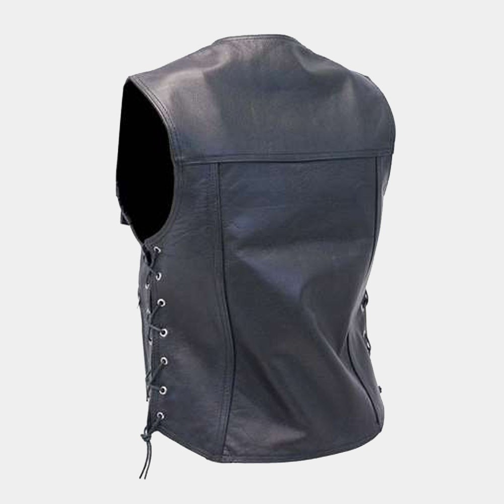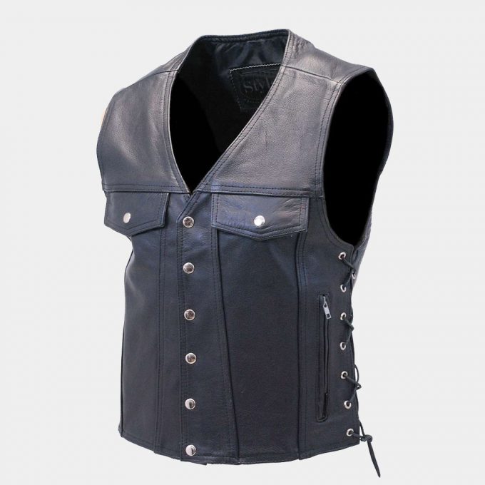 Long leather biker vest for men.A long leather biker vest for men. Two Inside chest pockets, zip front pockets, dark or silver hardware, soft nylon lining and lots more.