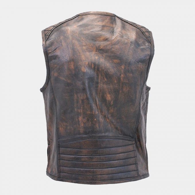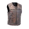 Men’s Montana vest with dual gun pockets in a vintage brown finish with hand rubbed antiquing. The hand work gives this vest its unique character. Made of premium soft buffalo leather. Features a large panel back great for patches, zipper front pockets and zip sides for comfort.
