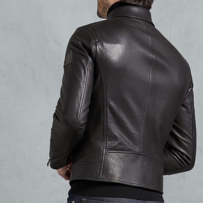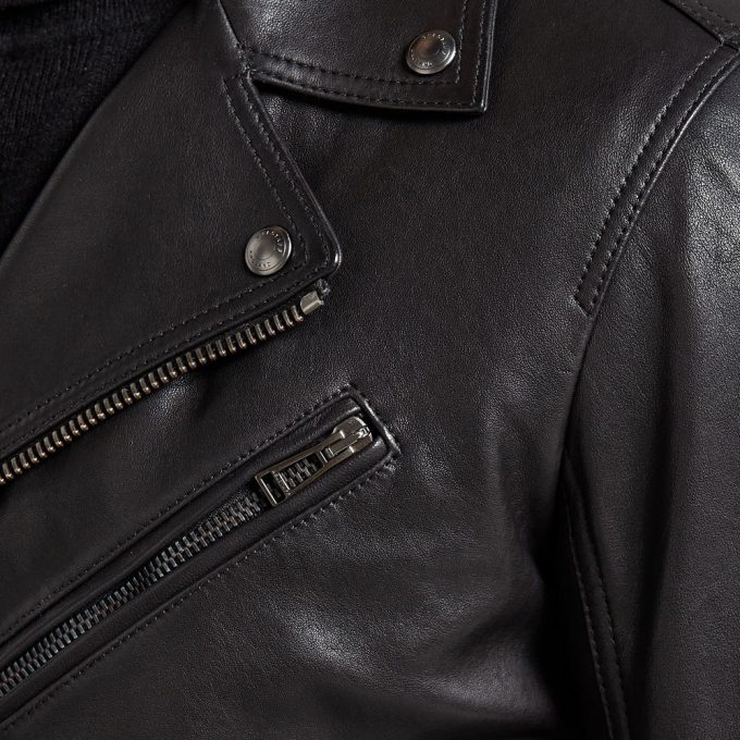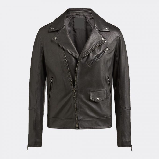 Men Fashion Leather Jacket  The men’s Fenway jacket, in black, is crafted from vegetable tanned nappa leather, while a subtle wax coating adds a luxurious feel to this clean biker style. This care is carried through to the detailing, with epaulettes, a zipped access pocket sitting just under a press-studded notched lapel, and an asymmetric zip closure giving both the look and feel of a modern classic. Two lower zip pockets, articulated elbow construction and zipped cuffs complete the silhouette in style.
